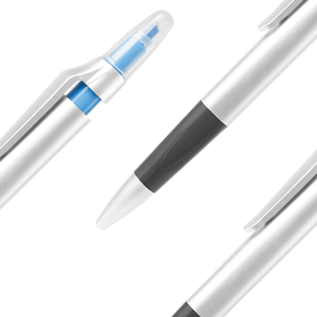 Caneta esferográfica plástica com duas funcionalidades. Os marcadores estão disponíveis nas cores: Azul, verde lima e rosa. Personalização em impressão digital ou gravação a laser