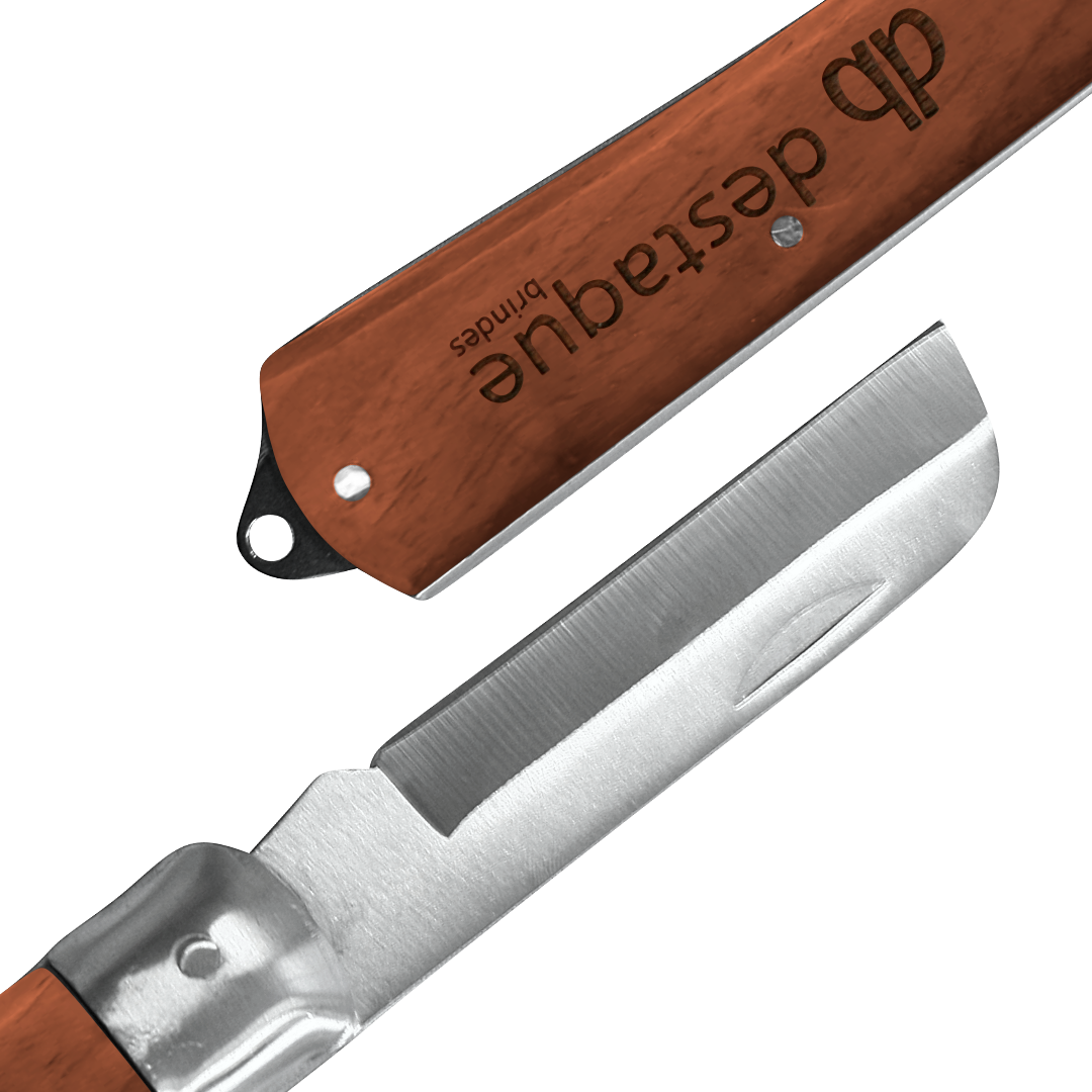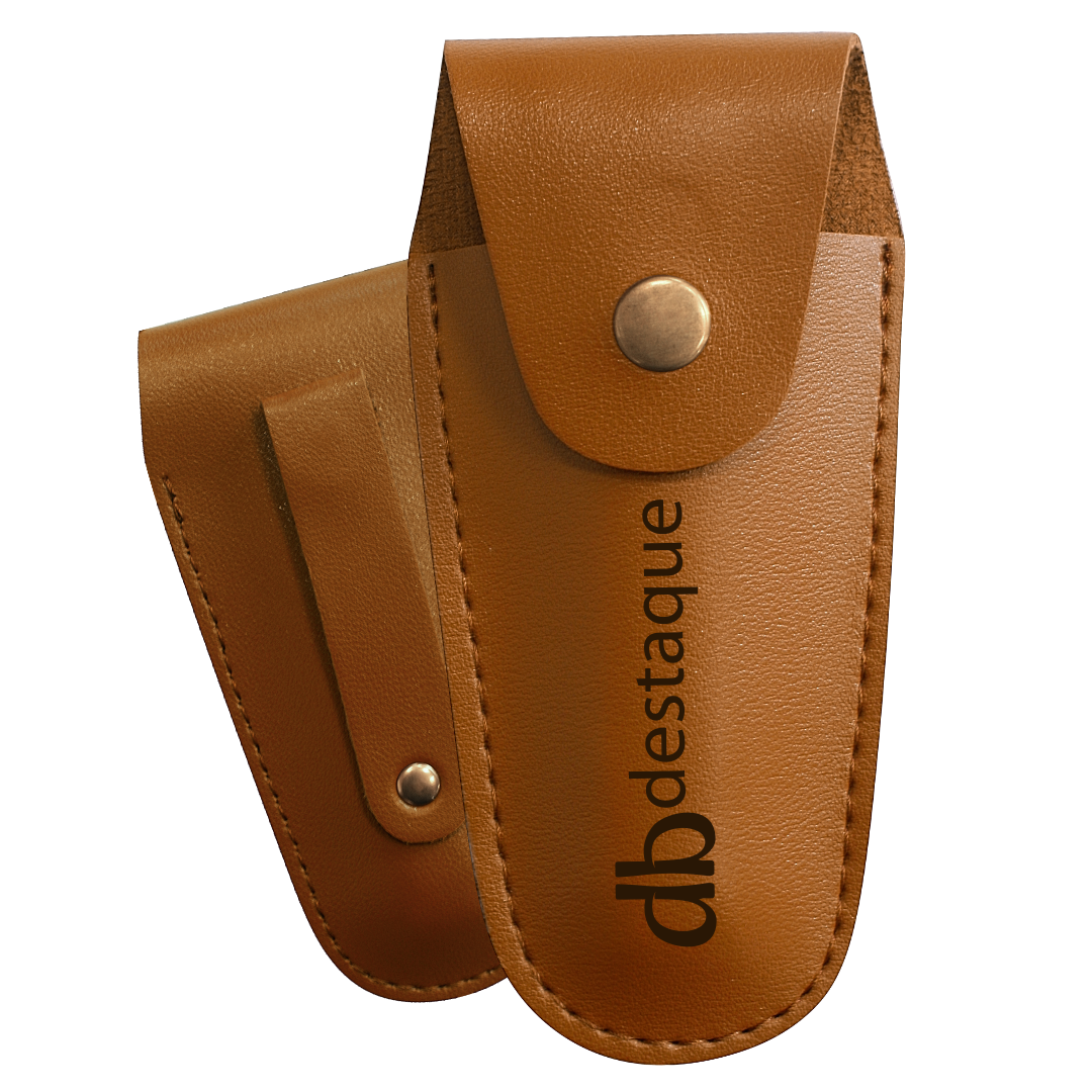 Canivete de madeira com estojo de couro. Alta resistência e durabilidade, seu estojo em couro possui um passador de cinto para mantê-lo sempre junto a você por onde estiver. Personalização a laser